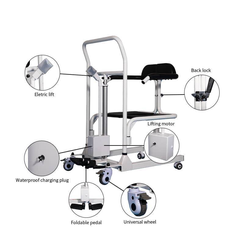 حمل و انتقال آسان بیمار و سالمندان به سرویس بهداشتی و حمام/قابلیت جداسازی آسان قطعات و انتقال به محیط دیگرقابل شستشو، دارای رنگ کوره ای الکترو استاتیک/دارای دریچه و محفظه سرویس بهداشتی/قابلیت استفاده به عنوان ویلچر و بالابر سیار/تولید شده از آلیاژ فولادی و آلومینیومی در نسخه های سفارشی/دارای پوشش رنگ الکترواستاتیک کوره ای، ضد زنگ/قابلیت انتقال بیمار با وزن ۱۲۰ کیلوگرم/شارژ با برق شهری و باتری ۵ آمپری/شارژی و ریموت کنترل /دارای ریموت کنترل و نمایشگر شارژ/پوشش صندلی جداشونده و قابل شستشو/ابعاد: ۵۷ در ۹۰ سانتیمتر با ارتفاع ۱۰۰ سانتیمتردارای حداقل ارتفاع ۴۰ سانتیمتر در نشیمنگاه و حداکثر ۷۰ سانتیمتر (کورس ۳۰ سانتیمتری جک بالابر)